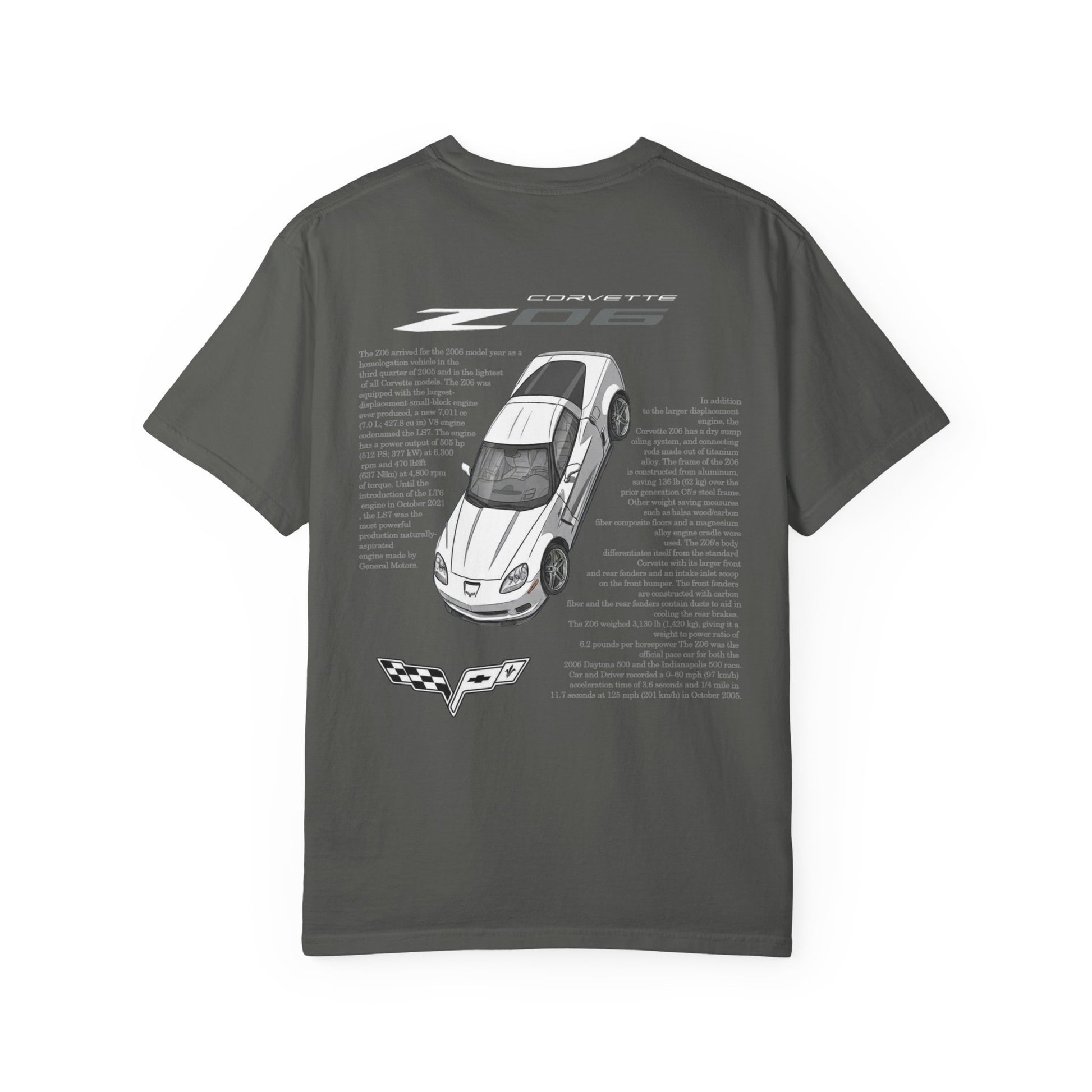 So many cool things to say about the Z06 so I made a shirt with everything! Made with 100% ring-spun cotton. The relaxed fit makes it an excellent daily choice. The double-needle stitching throughout the tee makes it highly durable, while the lack of side seams helps the shirt retain its tubular shape.